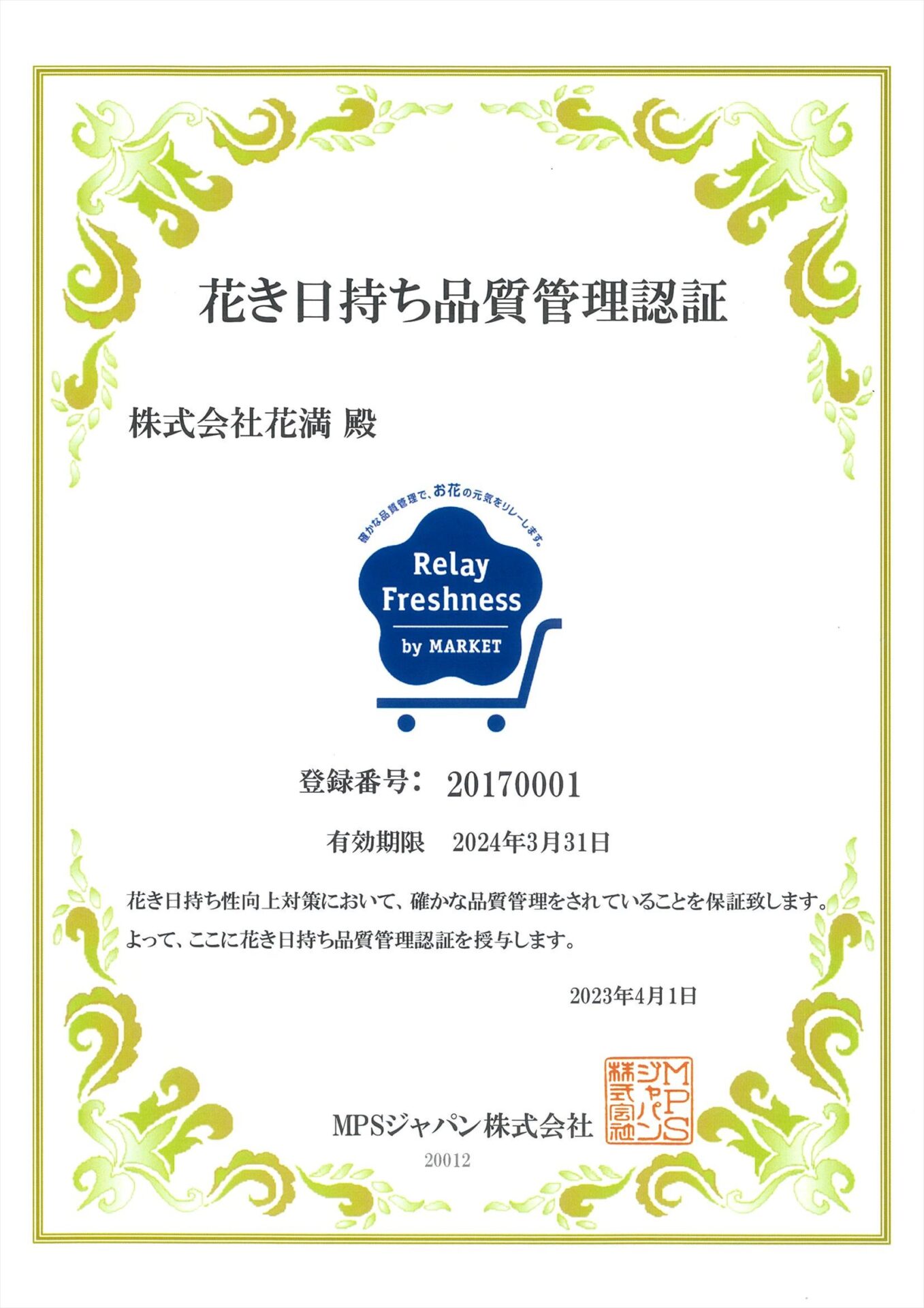 株式会社花満は、MPSのGPAに加え、平成29年7月7日付で、花き日持ち品質管理認証を取得いたしました。